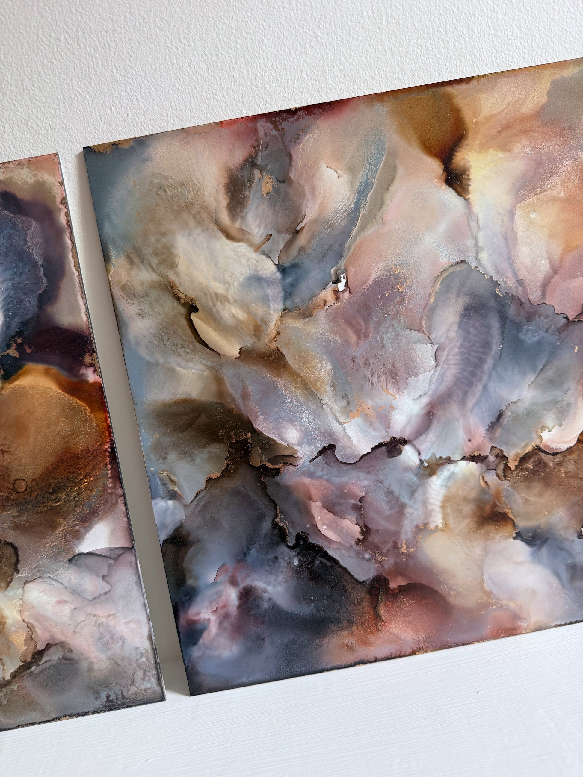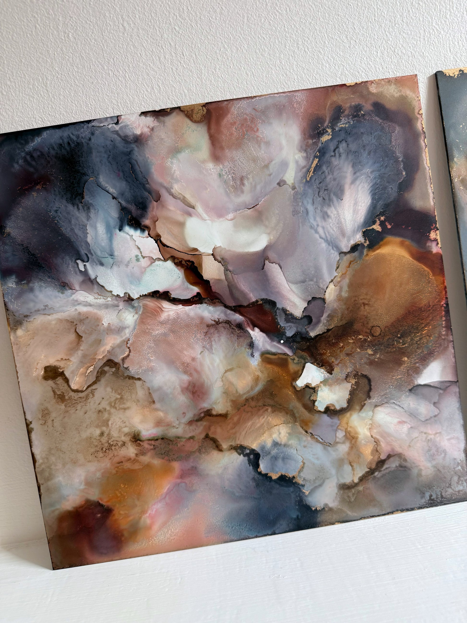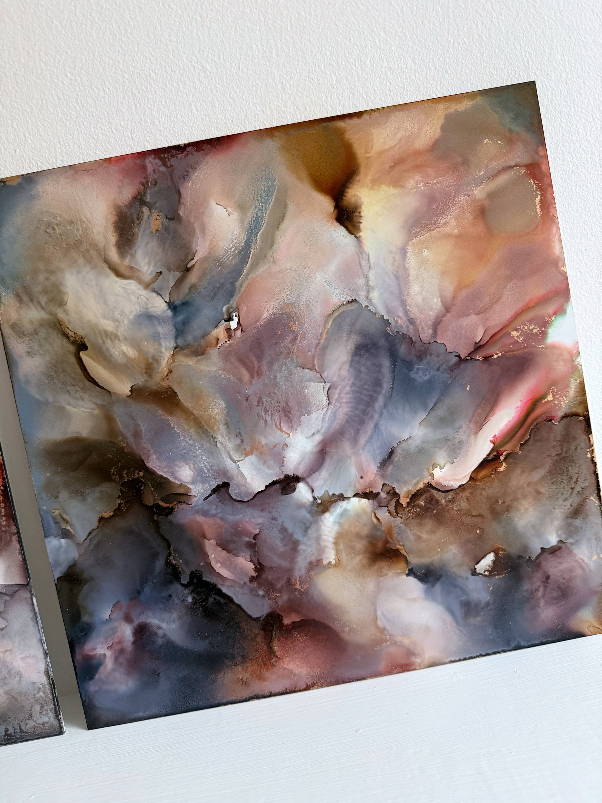 A diptych of two 30 x 30cm alcohol ink and mixed media original artworks on premium lightweight aluminium art panels. From the 'A Journey Within' Collection.