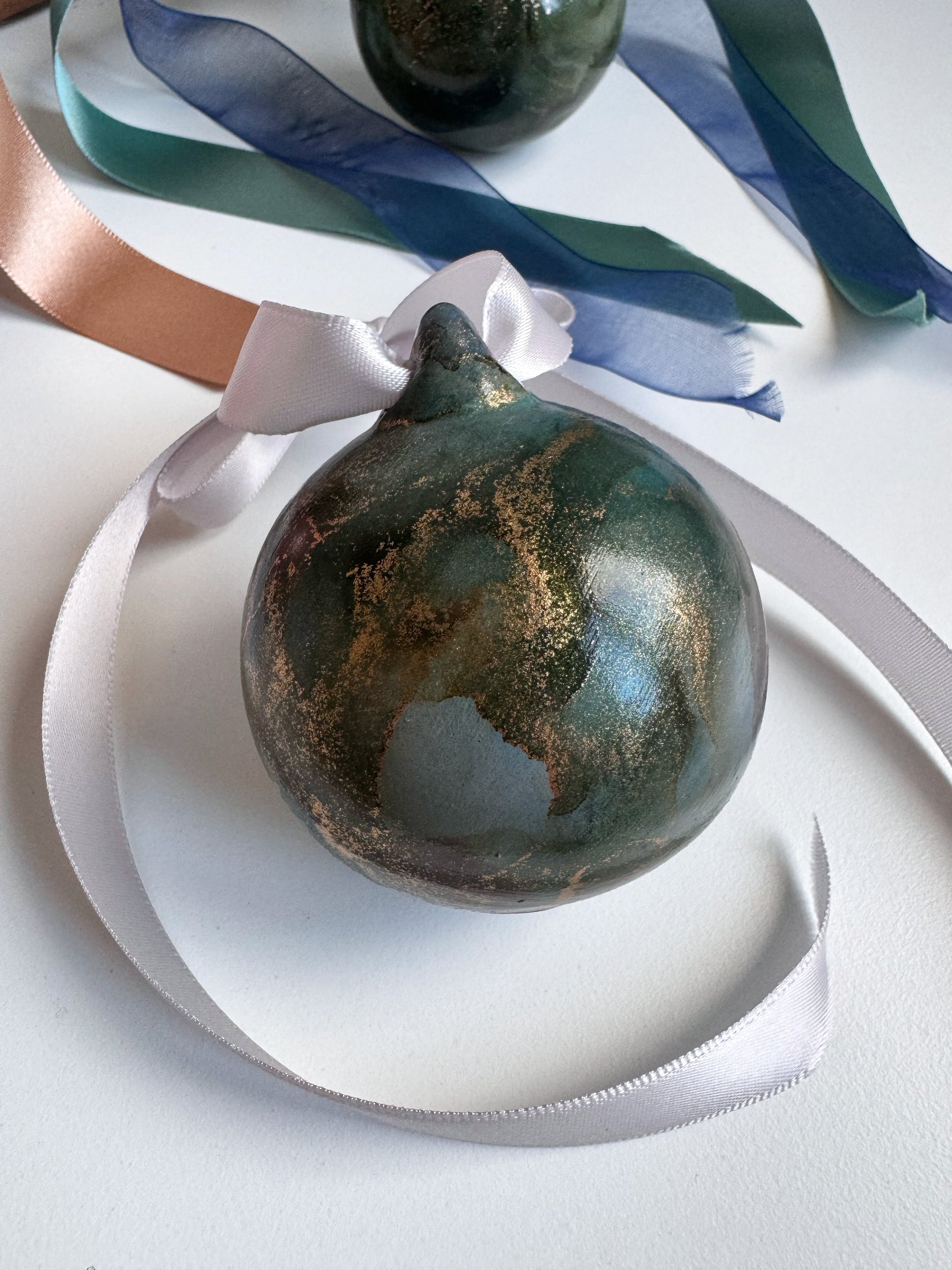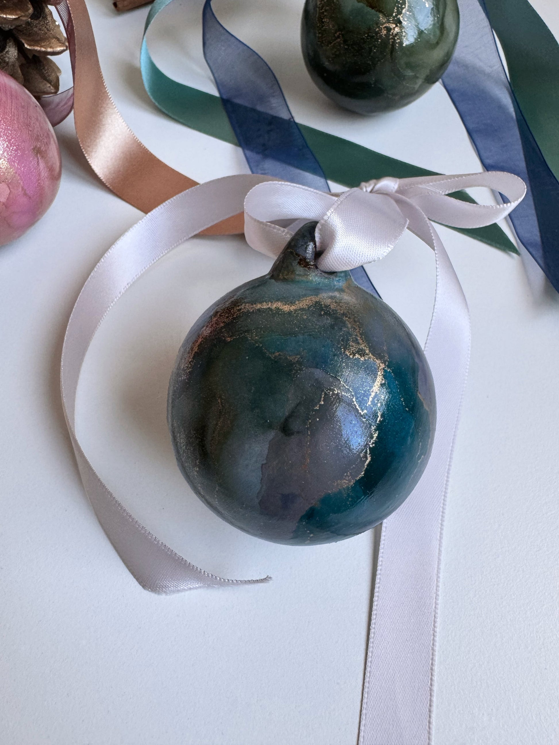 6cm alcohol ink painted ceramic bauble with ribbon.