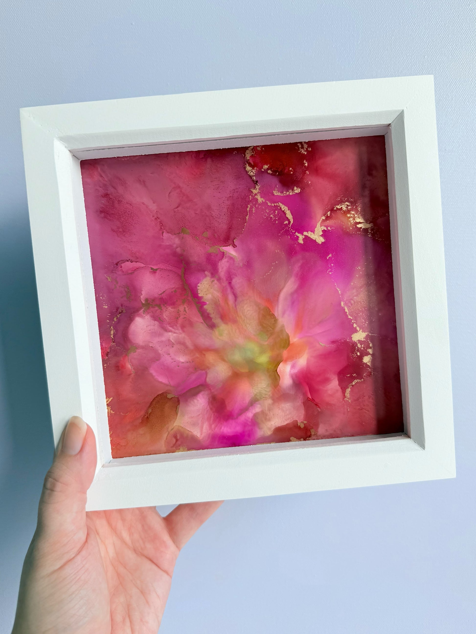 6.5 x 6.5" alcohol ink original artwork on synthetic paper. Set in a white deep box frame*, overall size 7.5 x 7.5".