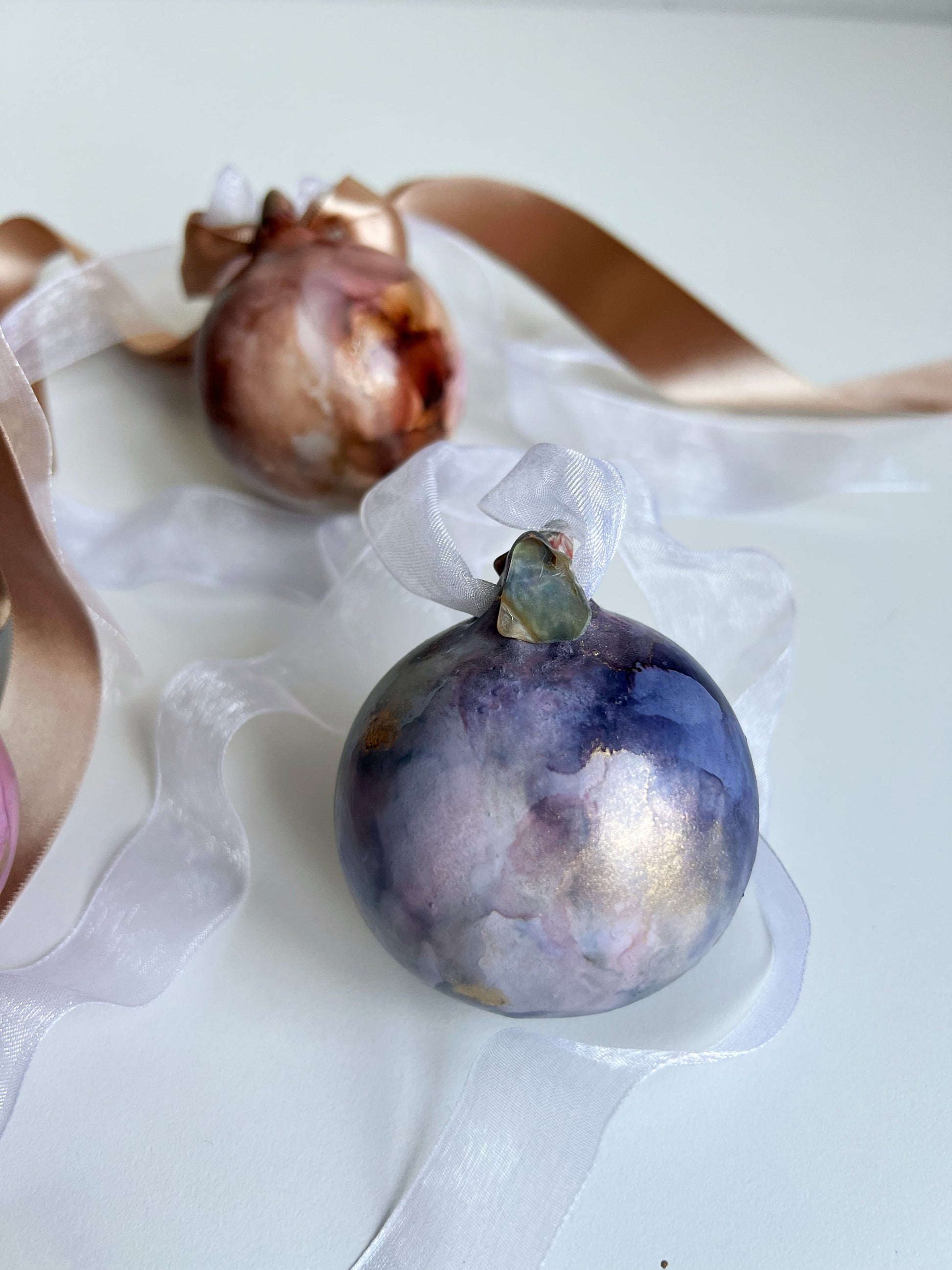 6cm alcohol ink and mixed media ceramic bauble with abalone 'crown' pieces and ribbon with pearl details.