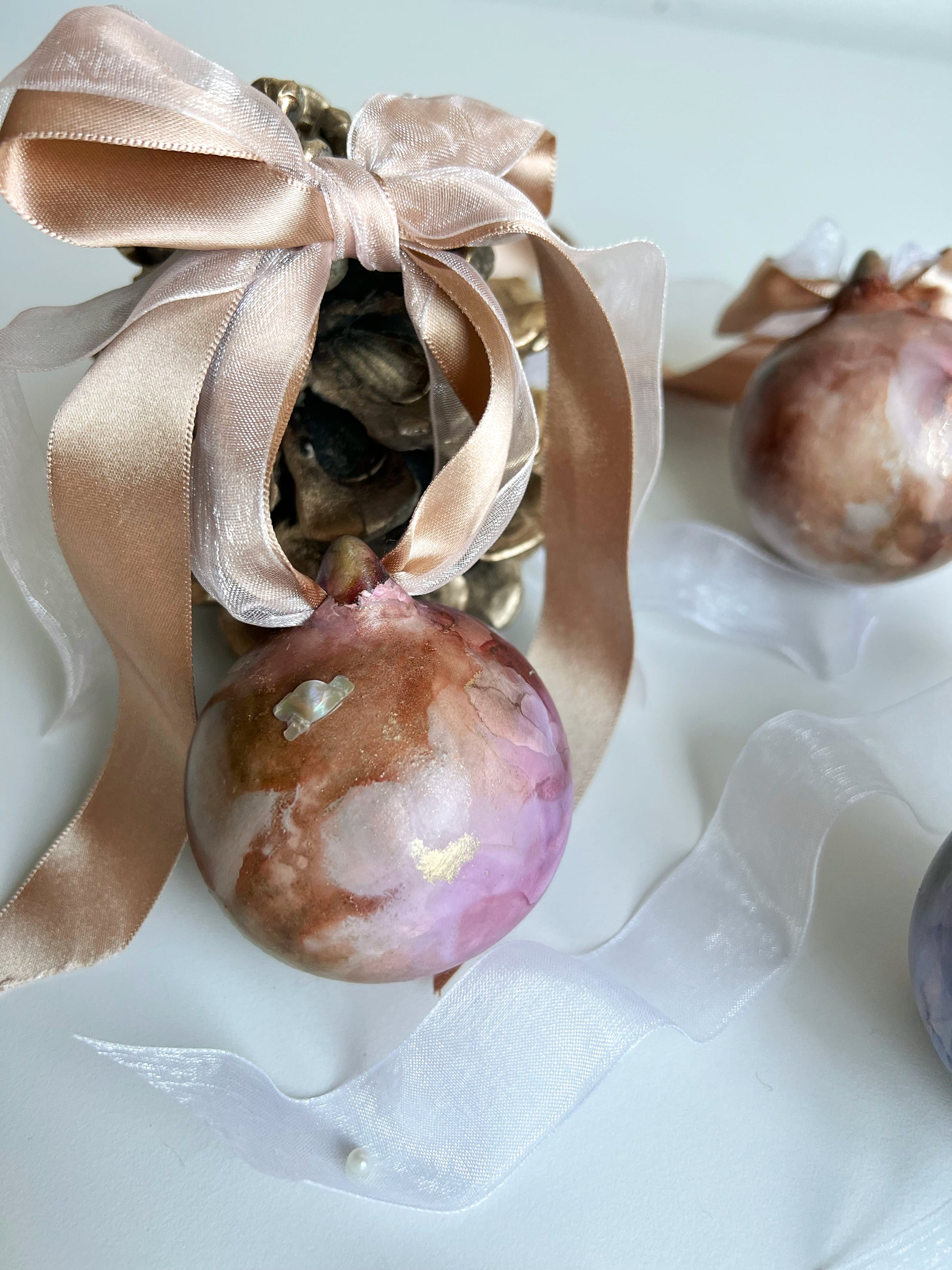 6cm alcohol ink painted ceramic bauble with mother of pearl and double ribbon.