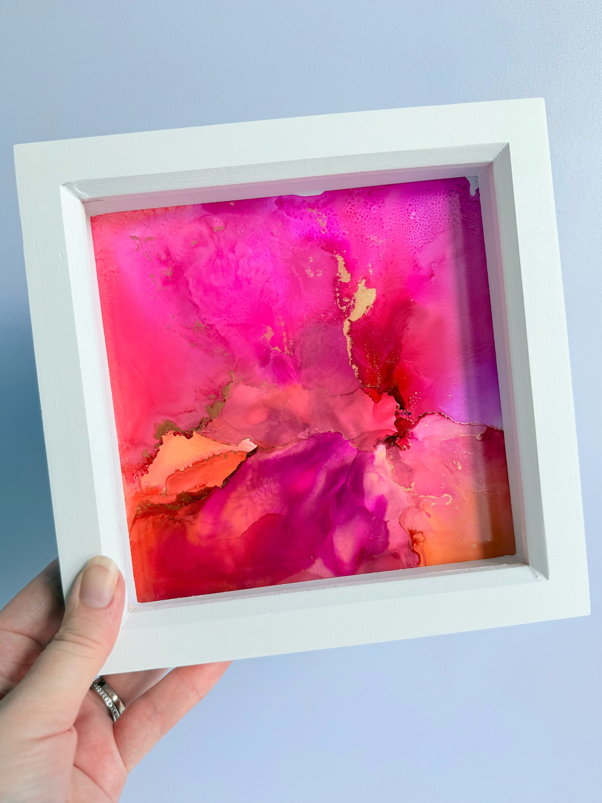 6.5 x 6.5" alcohol ink original artwork on synthetic paper. Set in a white deep box frame*, overall size 7.5 x 7.5".