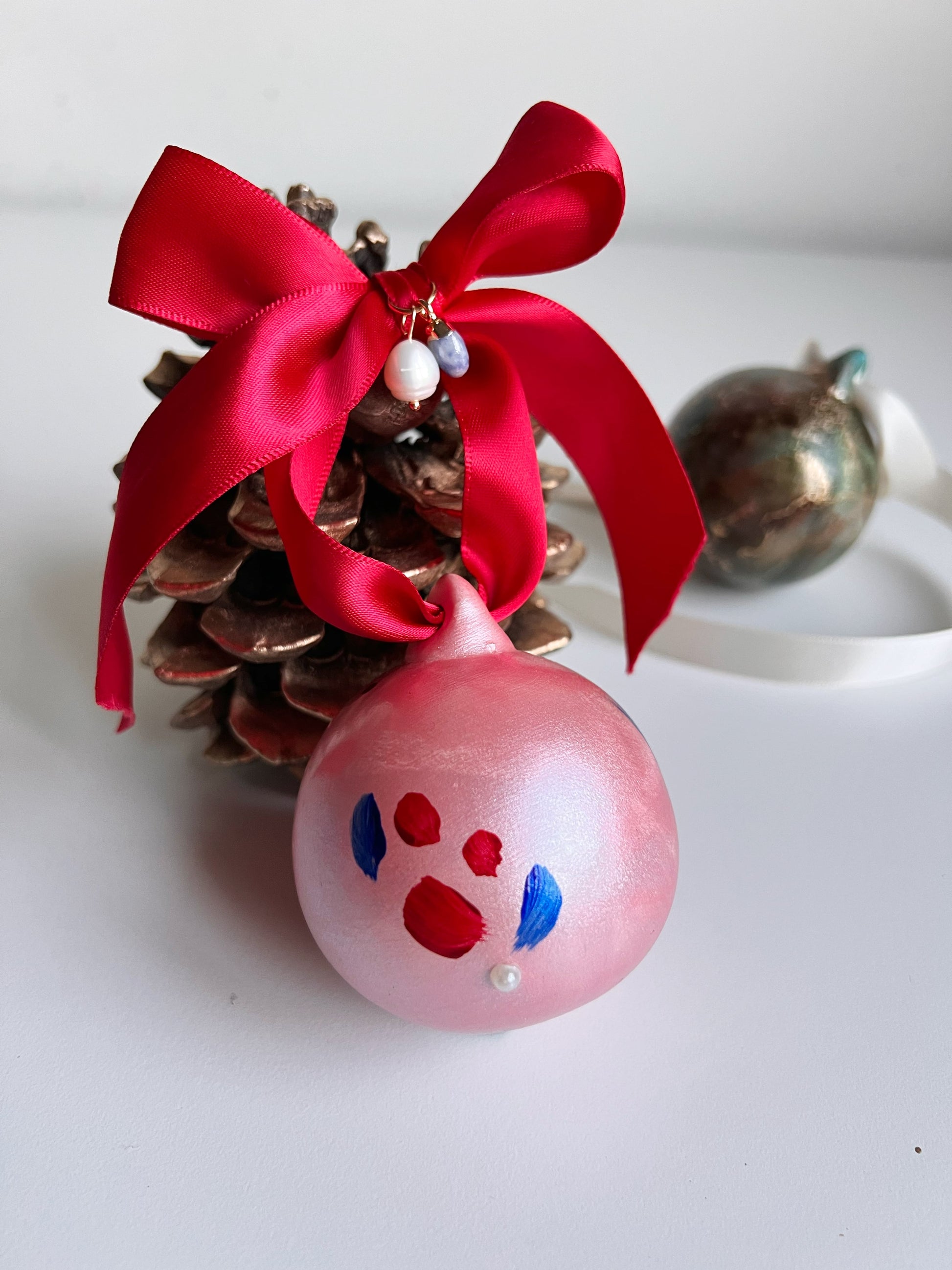 6cm acrylic ink painted ceramic bauble with pearl details and ribbon with freshwater pearl and blue spot jasper charms.