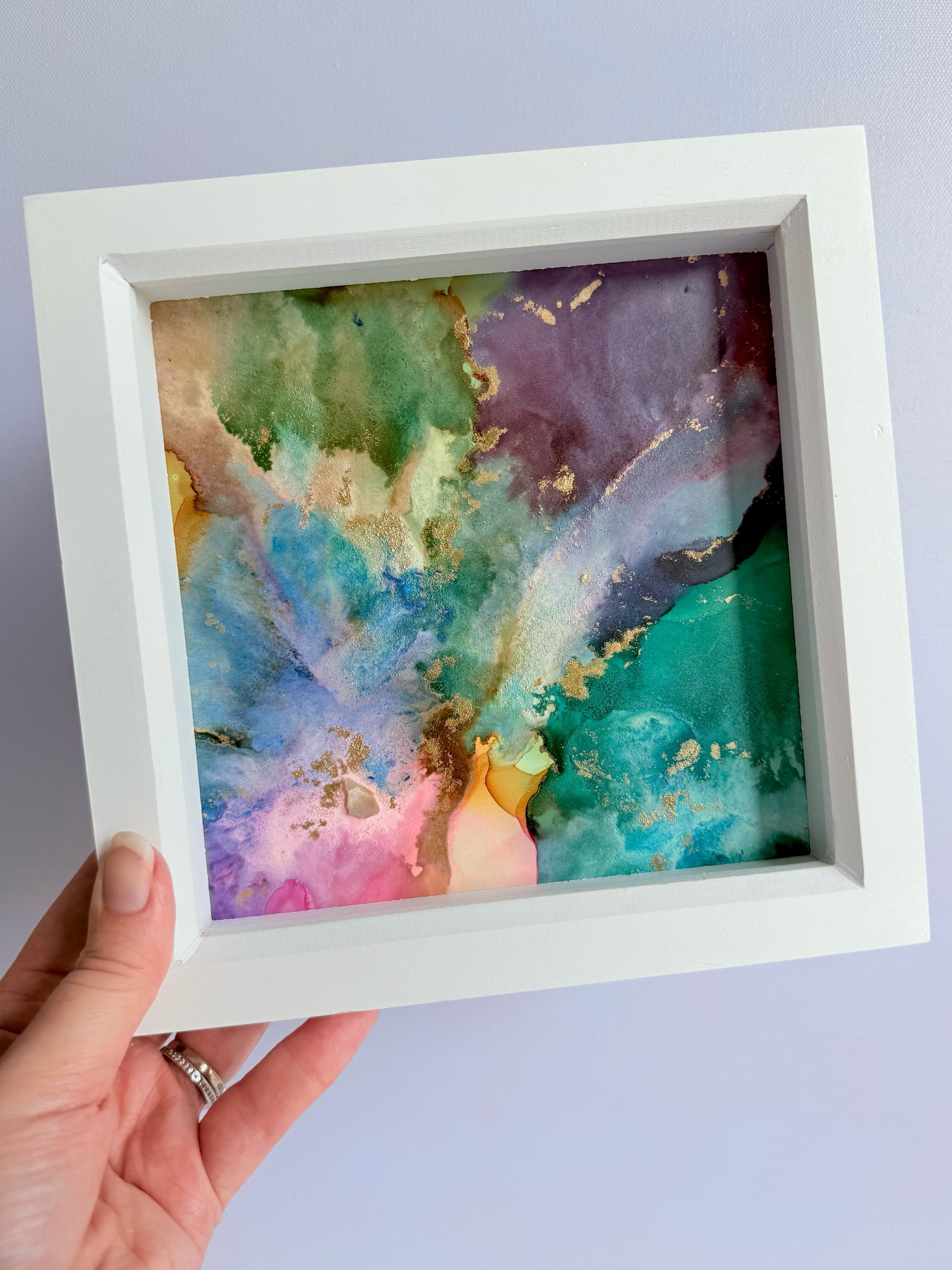 6.5 x 6.5" textured alcohol ink original artwork with gentle iridescence and mother of pearl detail on synthetic paper. Set in a white deep box frame*, overall size 7.5 x 7.5".